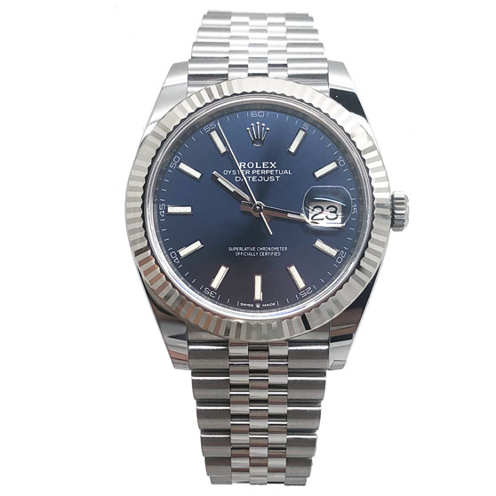 Unworn Rolex Datejust 41mm in stainless steel with 18K WG fluted bezel and crisp blue dial. Complete with box & papers – warranty card dated 9/2020