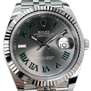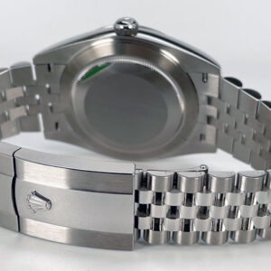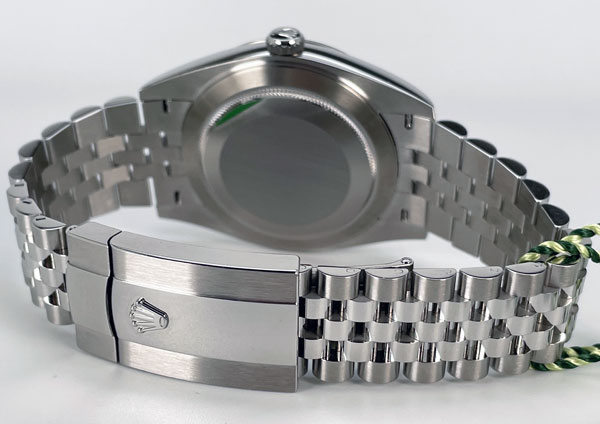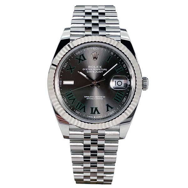Unworn Datejust 41 126334 in stainless steel featuring a slate grey dial with black Roman hour indexes that are trimmed in Rolex green. This timepiece comes complete with the original box, warranty card, tag and booklets (2022).