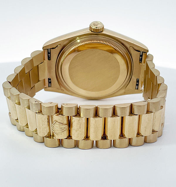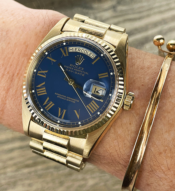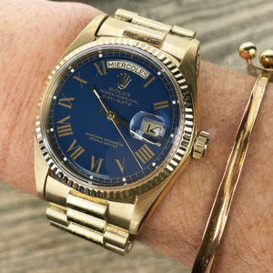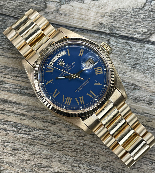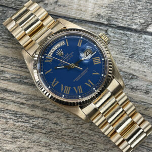 Great vintage Rolex Day Date 1803 in 18K YG with an original blue “buckley” Roman dial and original Presidential bracelet.