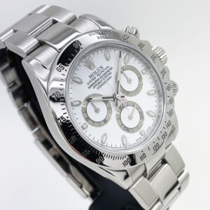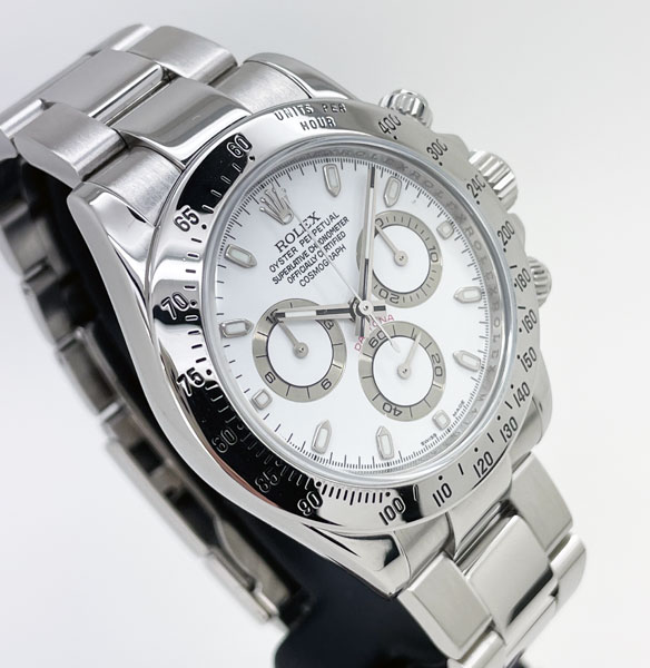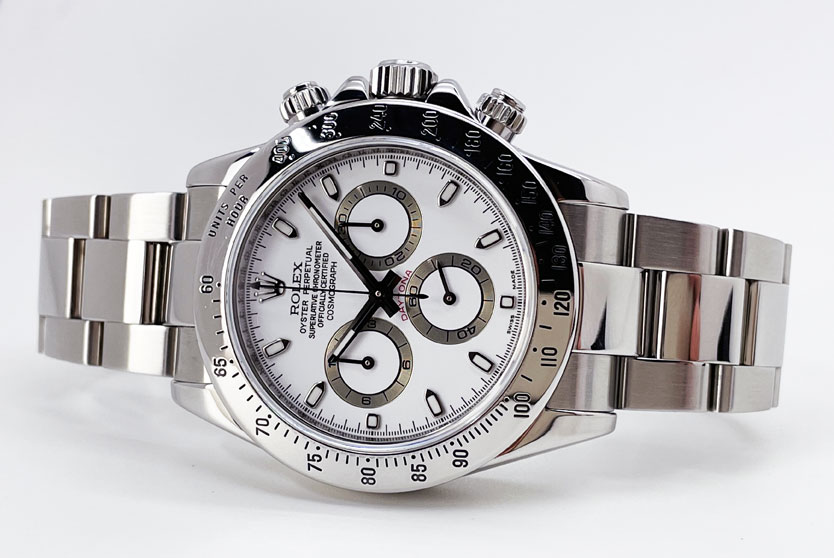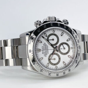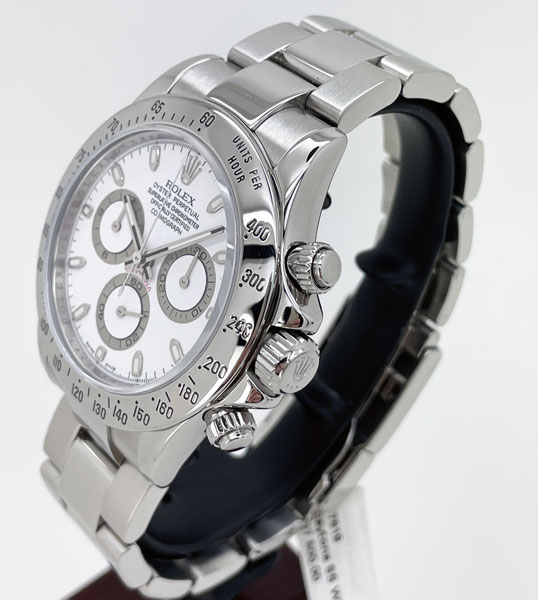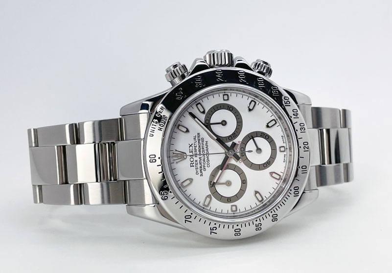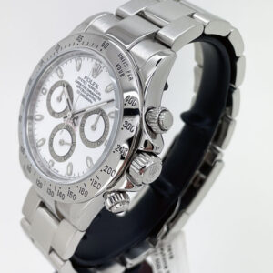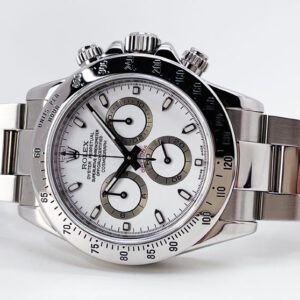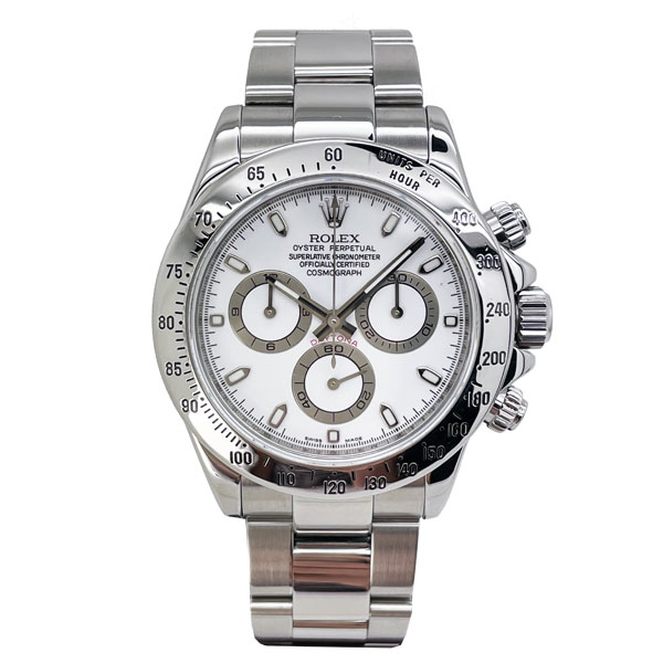 Pre-Owned Rolex Daytona 116520 in full stainless steel & featuring a white dial. This Cosmograph Daytona has some wear and is in good condition.
