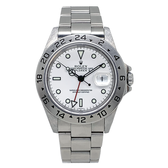 Rolex Explorer II 16570 features a white dial and has the original box & booklets.