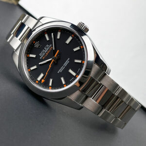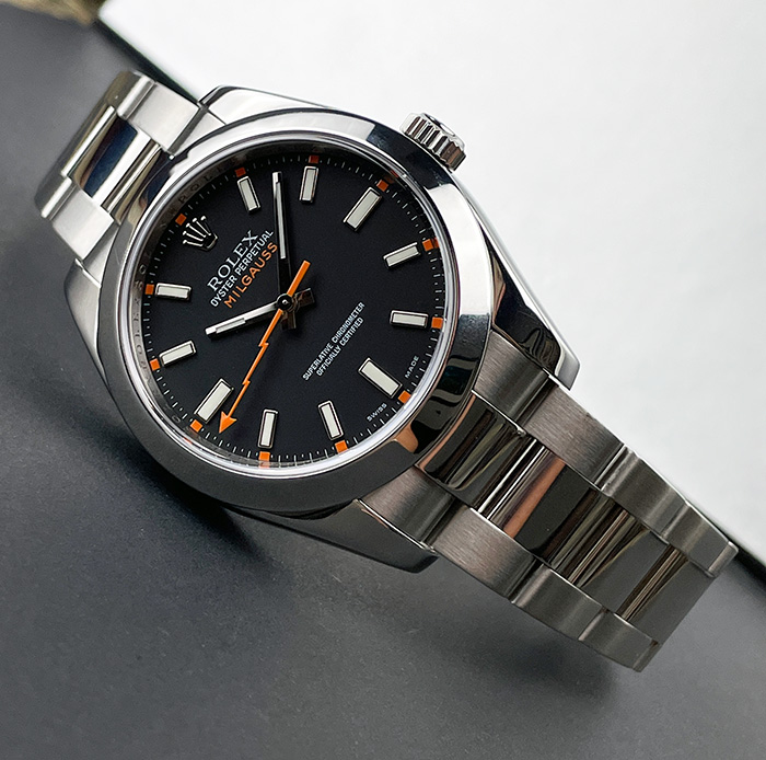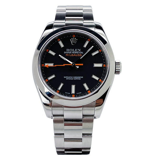 Excellent condition Pre-Owned Rolex Milgauss 116400 featuring a black dial and clear sapphire crystal;