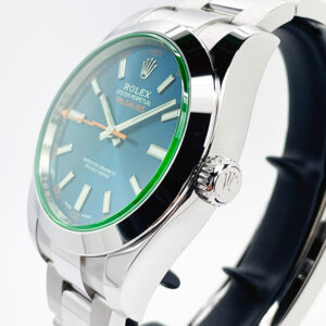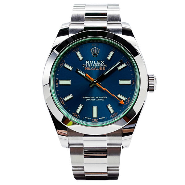 Mint condition Rolex Milgauss 116400GV featuring a blue dial and green sapphire crystal.