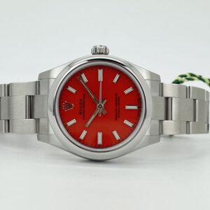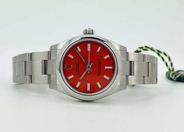 Unworn Rolex Oyster Perpetual in 31mm featuring a red / coral red dial and luminous hour markers.
