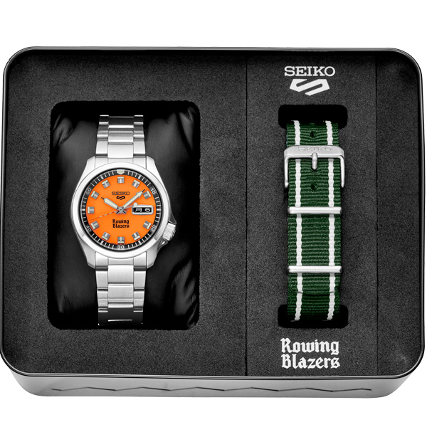Introducing the Seiko 5 x Rowing Blazers 2022 SRPJ57. This Rowing Blazer Collection is limited to 888 pieces and comes with an additional coordinating strap.