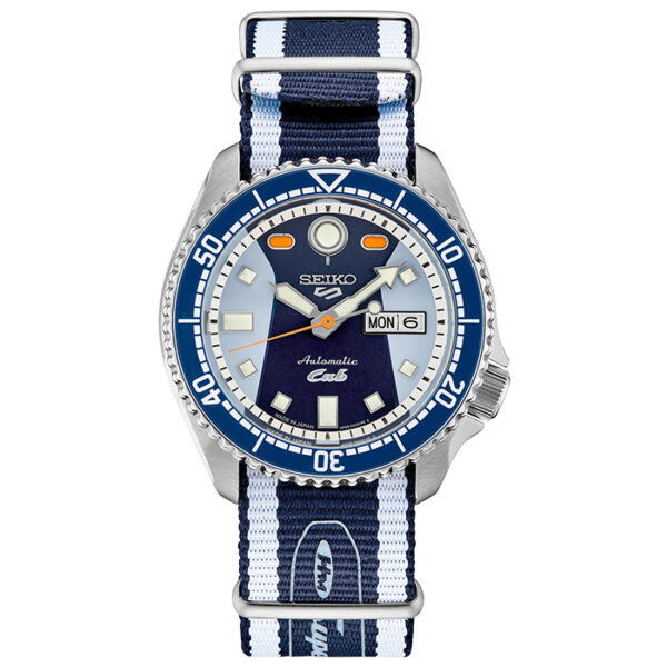 Seiko 5 Sports Honda Cub Limited Edition. Created in collaboration with Super Cub, Honda’s urban motorbike and partner, this exciting Limited Edition, available only in a controlled-production run of 7,500 with the serial number engraved on each caseback, expresses the essence of the world-renowned bike. The dial, in one of the most popular Cub color variations, dark and light blue, features a stylized 12 o’clock marker representing the headlight with the orange 1 and 11 o’clock indices suggesting the blinkers, as well as a day/date calendar, luminous hands and markers, and an orange second hand. Other unique details include a fuel gauge design on the crown and a blue uni-directional rotating bezel, as well as a light and dark blue nylon strap that can be worn over clothing in biker style. Providing automatic technology that you control with every movement, this dynamic timepiece is powered by a 24-jewel movement that beats at a frequency of 21,600 vibrations per hour, with a power reserve of approximately 41 hours and manual winding capability, visible through a screwdown, see-through caseback displaying the Honda Super Cub logo.