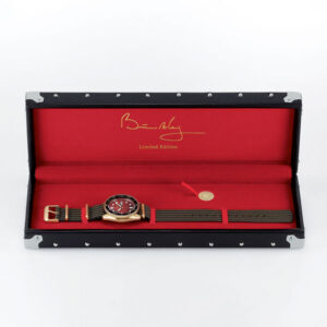The dial features a red and black dial with wood-texture pattern evoking May’s “Red Special” guitar and a see-through caseback with May’s signature. Each piece is accompanied with a limited edition collector’s box.
