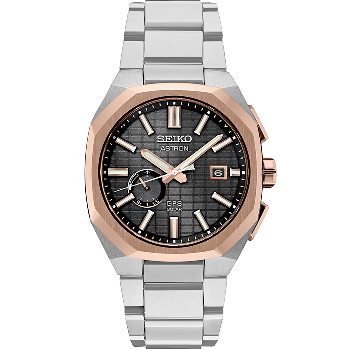 With the strong, sleek lines of the Seiko Astron, the world’s first commercially available quartz watch, today’s Astron is designed for a new generation of leaders, breaking through to the future with excellence in both innovation and style. Strong and distinctive, with its perfectly sculpted octagonal titanium bezel in rose gold finish, this dynamic timepiece combines solid tailoring with the highest degree of accuracy possible in a wristwatch. Powered by Seiko’s new GPS solar caliber 3X62, with the improved receiver sensitivity required by the metallic bezel, this exceptional watch is GPS controlled for high-speed time and time zone adjustment to 39 time zones, and includes an in-flight mode and perpetual date calendar correct to the year 2100.