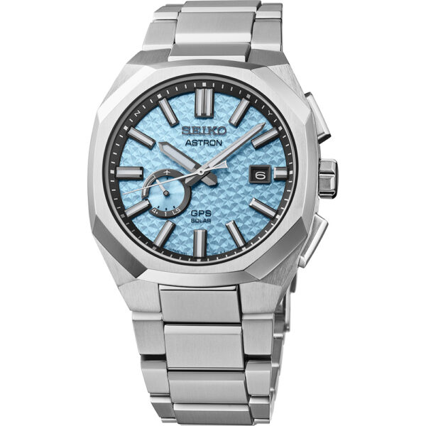 With the strong, sleek lines of the Seiko Astron, the world’s first commercially available quartz watch, today’s Astron is designed for a new generation of leaders, breaking through to the future with excellence in both innovation and style. Drawing inspiration from the theme of space evoked by the name Astron, this breathtaking design reflects stars glowing brightly in the night sky, beautifully expressed on its light blue die-stamp patterned dial with a unique star motif. Available only in a controlled-production run of 1,500, with the serial number engraved on each caseback, the distinctive Limited Edition, with its perfectly sculpted octagonal titanium bezel, combines solid tailoring with the highest degree of accuracy possible in a wristwatch. Equipped with Seiko’s GPS solar caliber 3X62, with the improved receiver sensitivity required by the metallic bezel, this exceptional watch is GPS controlled for high-speed time and time zone adjustment to 39 time zones, and includes an in-flight mode, perpetual date calendar correct to the year 2100, a signal reception result indicator and a power save function all powered by light energy, with no battery change required. The brilliant dial features a multi-function indicator subdial for easy mode reference, as well as sharp and highly visible three-dimensional applied indices, and LumiBrite hands and markers. Crafted of light and durable titanium with super-hard coating, this superb timepiece also offers a sapphire crystal with super-clear coating, secure screwdown caseback and tri-fold push button release clasp. 10 bar, 100M Water Resistant