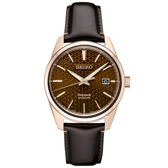 From the Presage Collection. Offering the finest in Japanese mechanical watchmaking, the Presage Collection blends precision technology with superior craftsmanship and design. Known for unique dials reflecting centuries of artistry, Presage embraces the fresh look of contemporary Japanese design with this coolly angular timepiece. The theme of energy is captured by the intricate dial pattern, based on the traditional hemp leaf motif of the Heian Period (794-1185 AD), a symbol of growth and prosperity. Uniquely shaped LumiBrite hands and stick markers add a crisp legibility to the gloss finish white dial, complete with date calendar. A sapphire crystal includes anti-reflective coating on the inner surface, while the screwdown see-through caseback provides a view of the 24-jewel automatic movement with manual winding capability, a frequency of 21,600 vibrations per hour and a power reserve of approximately 70 hours. With clean, sharp angles to highlight the beauty of the material, this bracingly modern watch is crafted of stainless steel with super-hard coating and tri-fold push button release clasp. 10 bar, 100M Water Resistant.