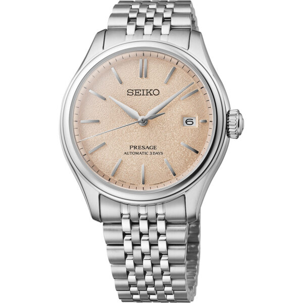 Presage Classic Series. Offering the finest in Japanese mechanical watchmaking, the Presage Collection blends precision technology with superior craftsmanship and design. The Presage Classic Series draws from the colors, materials, and textures of traditional crafts, each timepiece gracefully expressing Japan’s timeless beauty. In “araigaki”, a washed and bleached persimmon color, the curved dial of this streamlined design has a richly textured pattern that evokes the lustrous fabric, while capturing and reflecting ambient light to create a heightened sense of depth and beauty.