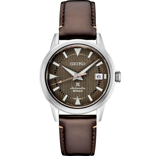 1959 Sport Watch Re-interpretation. Designed for those who treat life as the ultimate adventure, the Seiko Prospex line meets every challenge with technological excellence and style. This extraordinary timepiece re-interprets the watch that launched a rich legacy of over 60 years of sports watch excellence. Styled to fit contemporary tastes while evoking a vintage feel, this exceptional watch is as smooth and refined as the prized 1959 version, but far more powerful. The rich brown dial includes the original’s mountain-shaped markers at 12, 6 and 9, ensuring legibility while referring to its mountaineering inspiration, as well as LumiBrite hands and markers, a date calendar and a curved sapphire crystal with anti-reflective coating on the inner surface. The screwdown see-through caseback provides a view of the 24-jewel automatic movement, which beats at a frequency of 21,600 vibrations per hour, with a power reserve of approximately 70 hours, and offers manual winding capability. In stainless steel, with a brown cordovan strap. 20 bar, 200M Water Resistant