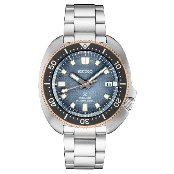1970 Diver’s Watch Re-Interpretation Special Edition. Designed for those who treat life as the ultimate adventure, the Seiko Prospex line meets every challenge with technological excellence and style. Part of a rich legacy of innovation in high-intensity timekeeping, Prospex continues to celebrate a long history of sports watch excellence with recreations and reinterpretations of landmark achievements. This distinctive Special Edition reimagines Seiko’s famed 1970 diver’s watch, complete with the iconic case design that revolutionized underwater safety with a recessed crown creating a built-in crown guard at 4 o’clock. Crafted of stainless steel with super hard coating, this masterfully updated design includes a sapphire crystal with anti-reflective coating on the inner surface, black and rose gold uni-directional rotating elapsed timing bezel, and screwdown crown and caseback, as well as a tri-fold push button release clasp with secure lock and extender. The patterned blue dial, suggesting the natural beauty of a lagoon, features a date calendar and LumiBrite hands and markers