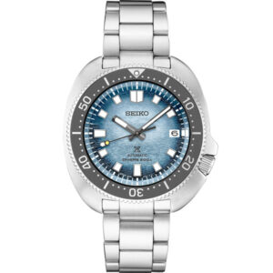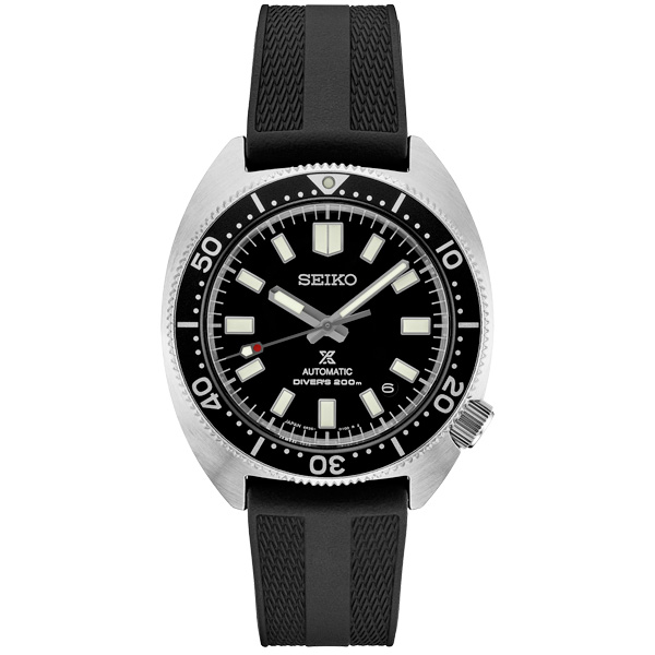 Prospex Automatic Diver’s Watch Re-Interpretation. Designed for those who treat life as the ultimate adventure, the Seiko Prospex line meets every challenge with technological excellence and style. Part of a rich legacy of innovation in high-intensity timekeeping, Prospex continues to celebrate a long history of sports watch excellence with recreations and reinterpretations of landmark achievements. With the thinnest case to date of any Seiko automatic diver’s watch, in stainless steel with super hard coating, this sleekly updated timepiece incorporates the distinctive cushion-shape and recessed crown of one of Seiko’s most iconic designs. Sporty and tailored, this versatile watch includes a curved sapphire crystal with anti-reflective coating on the inner surface, black uni-directional rotating elapsed timing bezel, and screwdown crown and caseback, as well as a black rail-pattern reinforced silicone strap inspired by the original model.