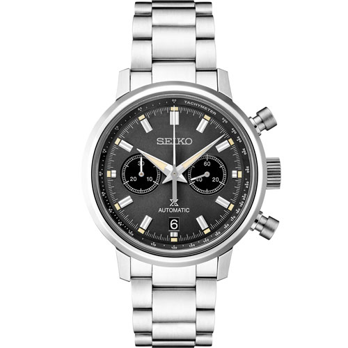 Seiko Prospex Speedtimer Limited Edition Mechanical Chronograph. Designed for those who treat life as the ultimate adventure, the Seiko Prospex line meets every challenge with technological excellence and style. Available only in a limited edition of 1,000, with the serial number engraved on each caseback to show its position in a controlled production run, this exceptional watch celebrates Seiko’s first precision chronographs, developed for international sporting competitions in 1964, as well as its 1969 introduction of the world’s first automatic chronograph. Providing chronograph measurement of up to 30 minutes of elapsed time in 1/8-second increments, the 34-jewel automatic movement, visible through the screwdown see-through caseback, beats at a frequency of 28,800 vibrations per hour, with a power reserve of approximately 45 hours and manual winding capability. The proprietary 8R46 movement includes a column wheel and vertical clutch mechanism allowing for smooth, stutter-free movement of the chronograph hand while providing longer wear and efficiency, and maintaining the power reserve better during chronograph operation. Crafted of stainless steel with super-hard coating and tri-fold push button release clasp, this extraordinary timepiece also features a clean white dial with hairline finish and LumiBrite hands and markers, topped by a dual curved anti-reflective sapphire crystal. An additional black leather strap is included in the special collectors’ box. 10 bar, 100M Water Resistant.