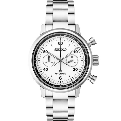 Seiko Prospex Speedtimer Limited Edition Mechanical Chronograph. Designed for those who treat life as the ultimate adventure, the Seiko Prospex line meets every challenge with technological excellence and style. Available only in a limited edition of 1,000, with the serial number engraved on each caseback to show its position in a controlled production run, this exceptional watch celebrates Seiko’s first precision chronographs, developed for international sporting competitions in 1964, as well as its 1969 introduction of the world’s first automatic chronograph. Providing chronograph measurement of up to 30 minutes of elapsed time in 1/8-second increments, the 34-jewel automatic movement, visible through the screwdown see-through caseback, beats at a frequency of 28,800 vibrations per hour, with a power reserve of approximately 45 hours and manual winding capability. The proprietary 8R46 movement includes a column wheel and vertical clutch mechanism allowing for smooth, stutter-free movement of the chronograph hand while providing longer wear and efficiency, and maintaining the power reserve better during chronograph operation. Crafted of stainless steel with super-hard coating and tri-fold push button release clasp, this extraordinary timepiece also features a clean white dial with hairline finish and LumiBrite hands and markers, topped by a dual curved anti-reflective sapphire crystal. An additional black leather strap is included in the special collectors’ box. 10 bar, 100M Water Resistant