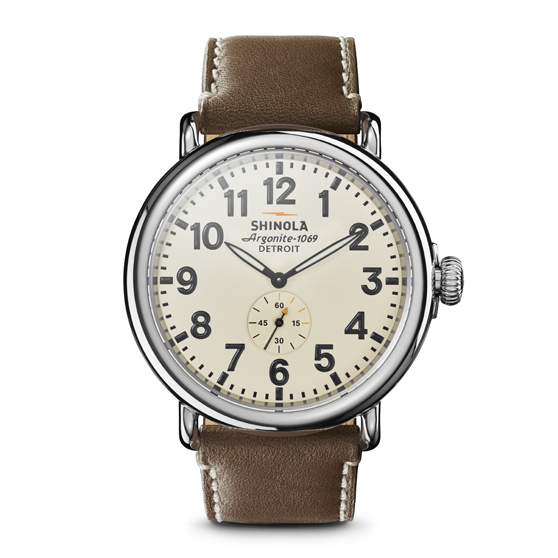 Our flagship style, the Runwell, is a simple and sophisticated watch crafted for decades of wear. This obsessively engineered watch is built to last and named accordingly. Two hands and a sub dial are driven by Shinola’s Argonite 1069 high-accuracy quartz movement. The solid stainless steel case features a classic pumpkin crown with double-domed sapphire crystal to protect the watch from scratches throughout years of wear. Go ahead, get attached.