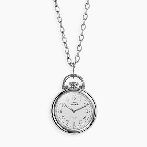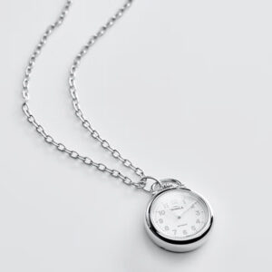 With a 24mm polished stainless steel case, it’s just slightly smaller than an American quarter and hangs delicately from an elegant 30” chain necklace.