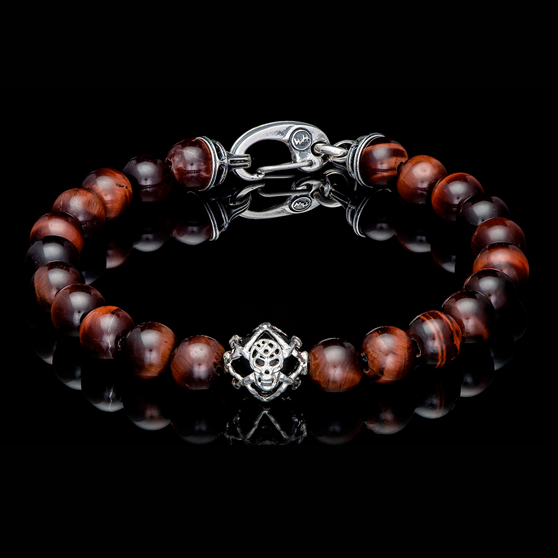 We love skulls, and the Sunset brings that iconic form to our new Embrace collection with a nod to rock n roll. The center bead is polished black onyx adorned with a stylish skull motif in sterling silver, surrounded by the soft (but slightly devilish) hues of red tiger eye. Finished with our sterling silver clasp system on micro paracord. On the wrist, solo or layered, this piece creates its own ambiance.
