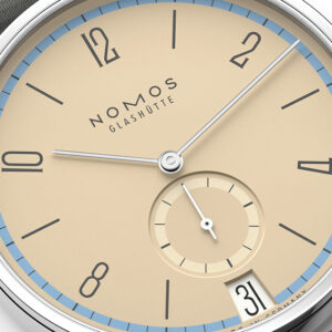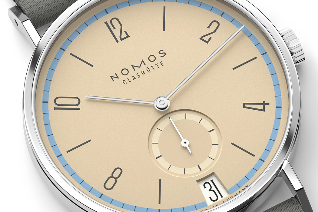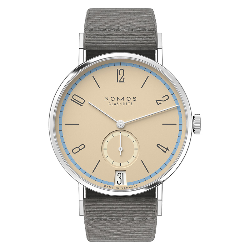 The NOMOS icon in color. Full of energy and complexity. For this special edition of the hand-wound Tangente 38 date model, numerous elements of the dial have been individually matched to the character of the watch. 31 special models for every day of the month, 31 different personalities—each limited to 175 pieces. Tangente date Ariel reminds you of far-away places, the wide open sky, and the vastness of space. But also of cool spring days, when the sky shimmers gently through the skylight. The watch unfolds its complex effect on almost all wrists, where it appears calm, content, and smart.