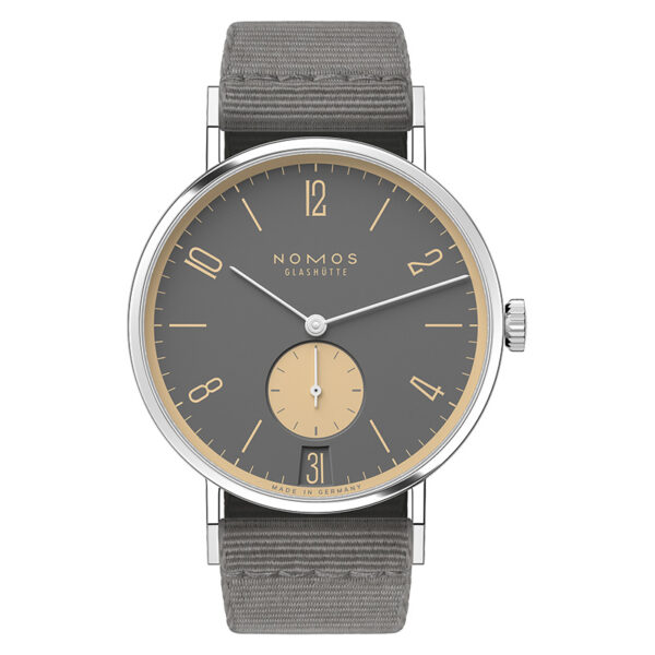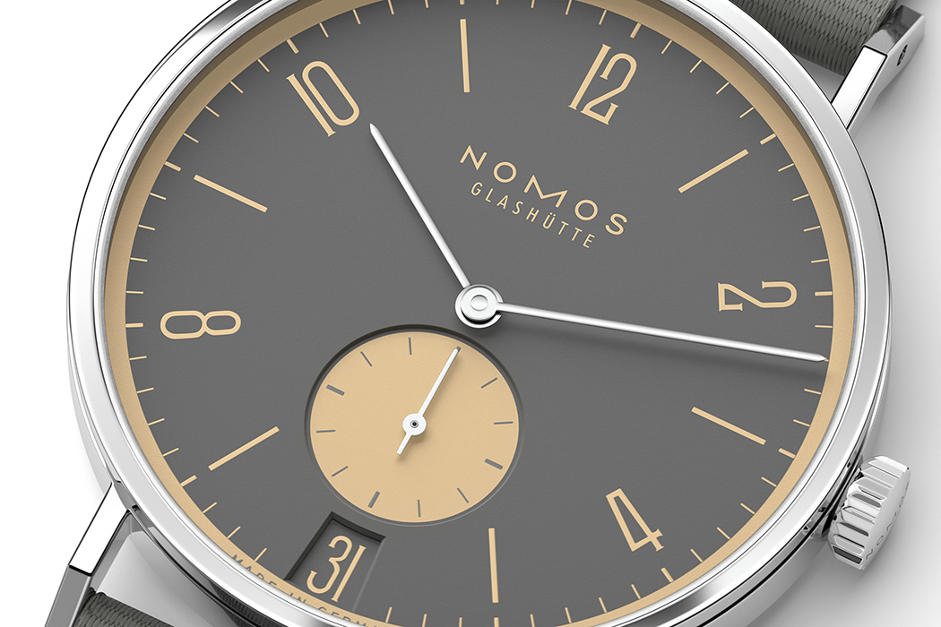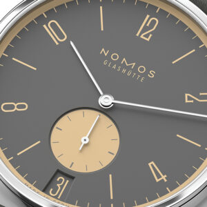 The NOMOS icon in color. Full of energy and complexity. For this special edition of the hand-wound Tangente 38 date model, numerous elements of the dial have been individually matched to the character of the watch. 31 special models for every day of the month, 31 different personalities—each limited to 175 pieces. Straightforward, almost architectural, gray defines the elements of this dial. For us, it is the gray of the gray shark that swims through lagoons and canals in tropical regions. A no-nonsense watch for those who are not in the mood for niceties.
