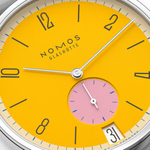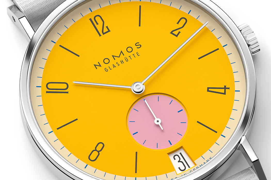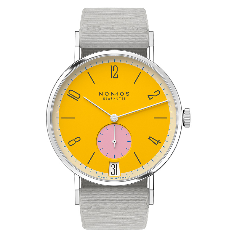 The NOMOS icon in color. Full of energy and complexity. For this special edition of the hand-wound Tangente 38 date model, numerous elements of the dial have been individually matched to the character of the watch. 31 special models for every day of the month, 31 different personalities—each limited to 175 pieces. Tangente date Katzengold shines in a particularly warm yellow on the wrist and attracts admiring glances from afar. A sunny model that is highly recommended on rainy days.