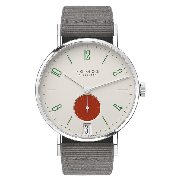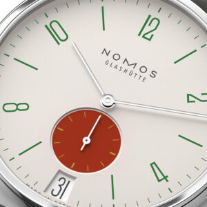 The NOMOS icon in color. Full of energy and complexity. For this special edition of the hand-wound Tangente 38 date model, numerous elements of the dial have been individually matched to the character of the watch. 31 special models for every day of the month, 31 different personalities—each limited to 175 pieces. The rich bright red of Tangente date Stop brings fire to the wrist and attracts attention, no matter what you wear with it.