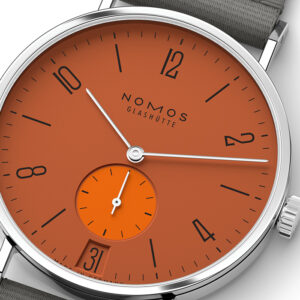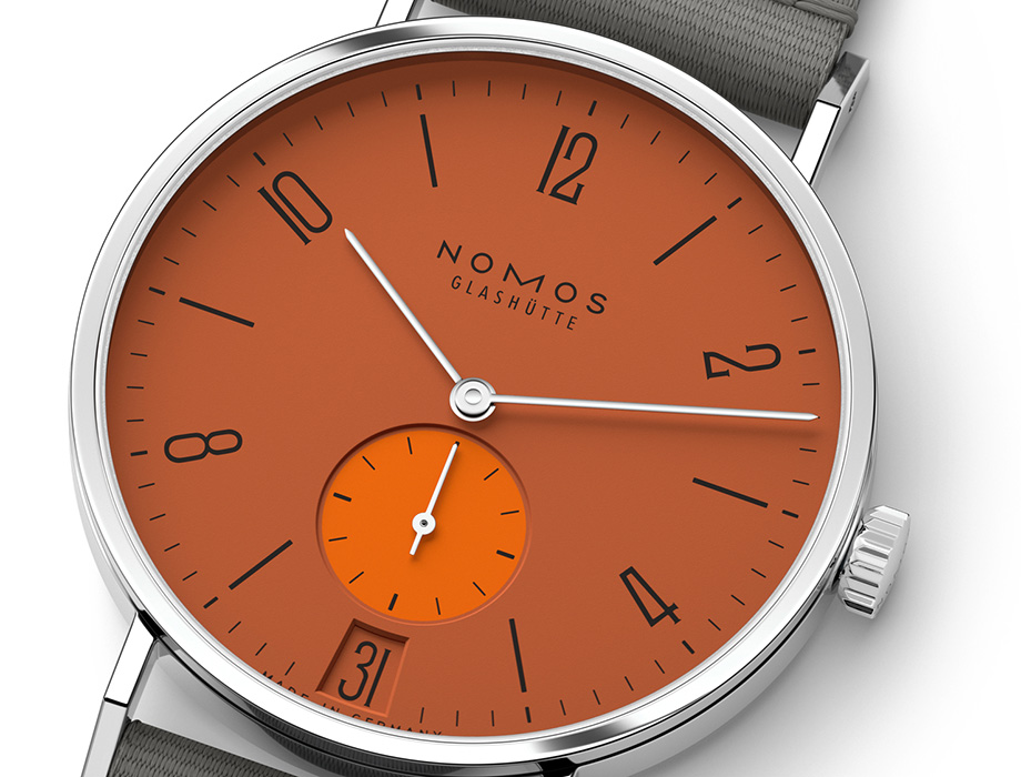 The NOMOS icon in color. Full of energy and complexity. For this special edition of the hand-wound Tangente 38 date model, numerous elements of the dial have been individually matched to the character of the watch. 31 special models for every day of the month, 31 different personalities—each limited to 175 pieces. Tangente date Poporange looks particularly spectacular when combined with white or dark blue. The bravest wear it tone on tone with curls in the fashion of the 70s.