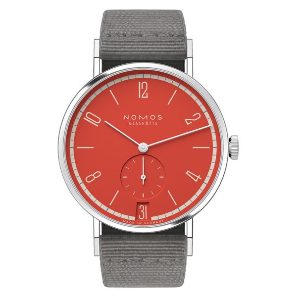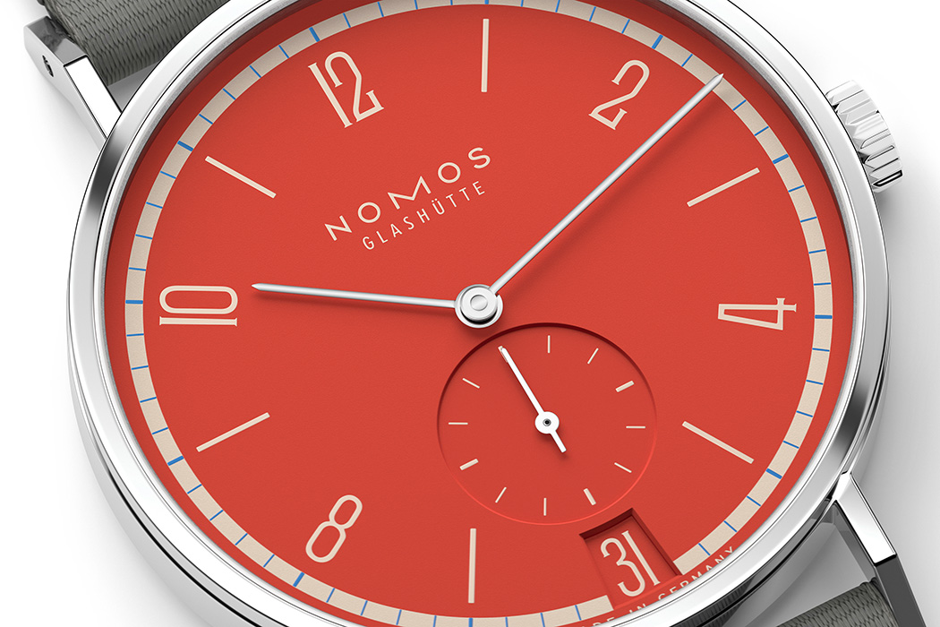 The NOMOS icon in color. Full of energy and complexity. For this special edition of the hand-wound Tangente 38 date model, numerous elements of the dial have been individually matched to the character of the watch. 31 special models for every day of the month, 31 different personalities—each limited to 175 pieces. Tangente date Rambazamba brings a party mood and joy to the wrist. This watch suits all extroverts and can always hold its own with any outfit.