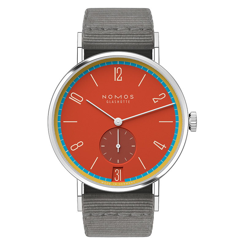 The NOMOS icon in color. Full of energy and complexity. For this special edition of the hand-wound Tangente 38 date model, numerous elements of the dial have been individually matched to the character of the watch. 31 special models for every day of the month, 31 different personalities—each limited to 175 pieces. Tangente date Sportbunt was created in the style of the old, much-loved GDR tracksuit worn by our watch designer Thomas; the watch is also reminiscent of 70s fashion, Olympic rings, and the bright and cheerful days of youth.