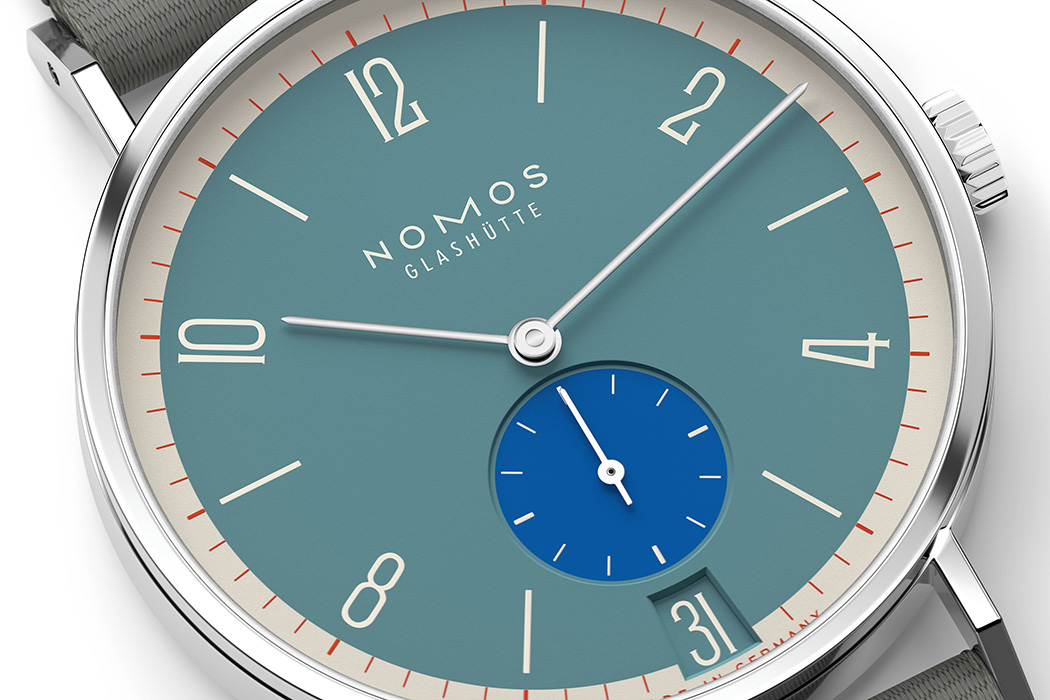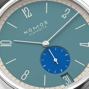The NOMOS icon in color. Full of energy and complexity. For this special edition of the hand-wound Tangente 38 date model, numerous elements of the dial have been individually matched to the character of the watch. 31 special models for every day of the month, 31 different personalities—each limited to 175 pieces. Tangente date Super Sardine is a colorful watch for people who tend to shy away from too much color or fashion. A watch with a vintage character for wearers who already describe themselves as classic—or are determined to become so one day.