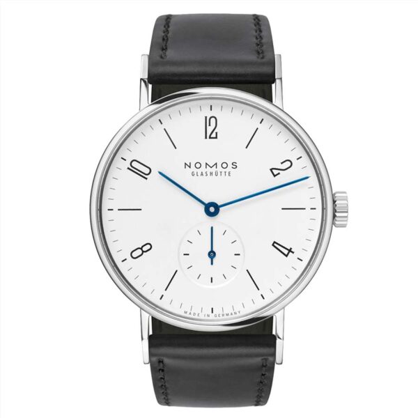 It is the watch of choice among architects and writers, a multiple prizewinner, and the iconic NOMOS timepiece: Tangente. With clear lines and perfect proportions, tempered blue hands on a white silver-plated dial, a strap from Horween Genuine Shell Cordovan. And of course—the hand-wound NOMOS Alpha caliber, visible through the sapphire crystal glass back; a classic itself.