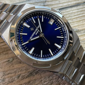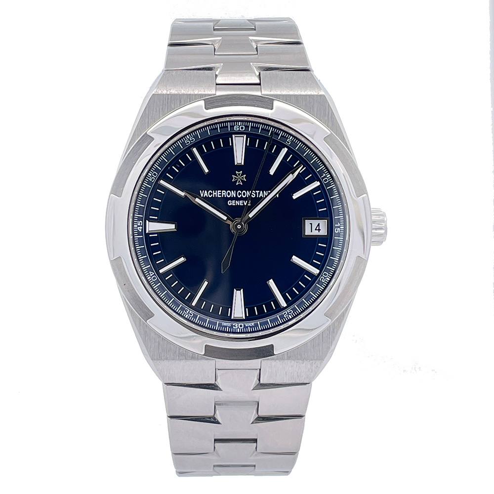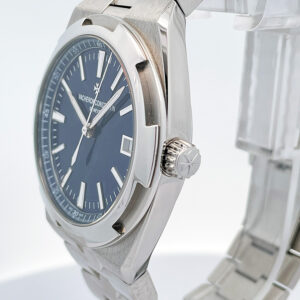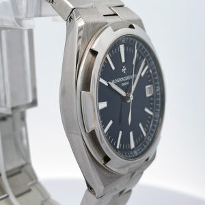 Mint condition pre-owned JVacheron Constantin Overseas 4500V in stainless steel with a stunning sunray blue dial. Featuring an automatic movement and comes with addition factory alligator strap with folding clasp