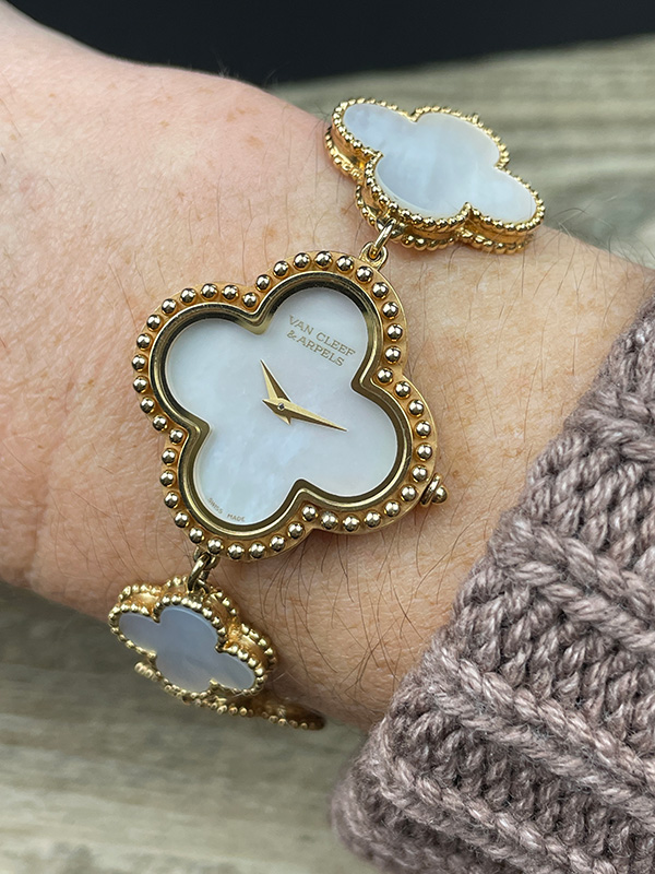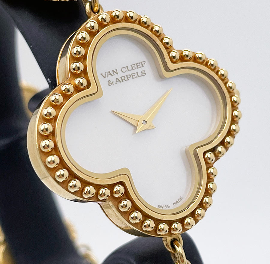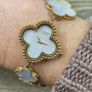 Beautiful Van Cleef & Arpels Charm watch (ref 136674) in 18K yellow & and mother of pearl. Each link in the bracelet also features 18K YG & mother of pearl.