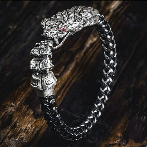 “Full Circle” sets a standard all its own. Inspired by the ‘snakeskin’ rubber and stainless cord, it features a sterling silver head that has a hinged and spring loaded jaw, which is operated by a hidden panel, allowing the jaw to open and release the tail. Tail is articulated with multiple rattles pinned and laser welded together for a mechanism that is fun to play with, and exceptional to wear. Eyes are inlaid with Red Topaz.