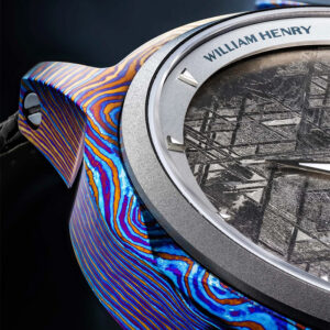 This tapestry in metal is crafted by a mastersmith in Ukraine specifically for this William Henry watch case, and we use heat to reveal the final pattern. Finished with a sapphire crystal and exhibition back revealing the Swiss automatic movement with a 38-hour power reserve. Water resistance is rated to 10 ATM/100 meters, and the hand-crafted leather strap features a custom stainless deployant clasp for easy wear and adjustment.
