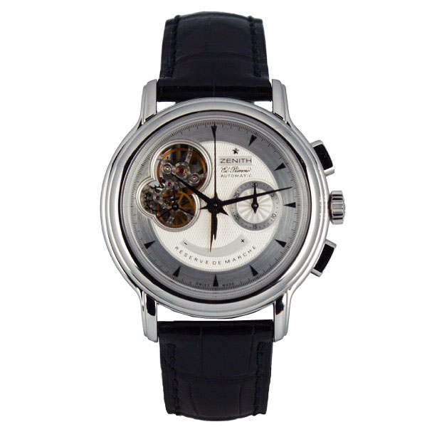 Pre-owned Zenith Chronomaster El Primero 03.024.4021/02 is in excellent condition. Featuring an exhibition caseback and open work dial. On an original Zenith alligator strap with a stainless steel folding clasp.