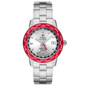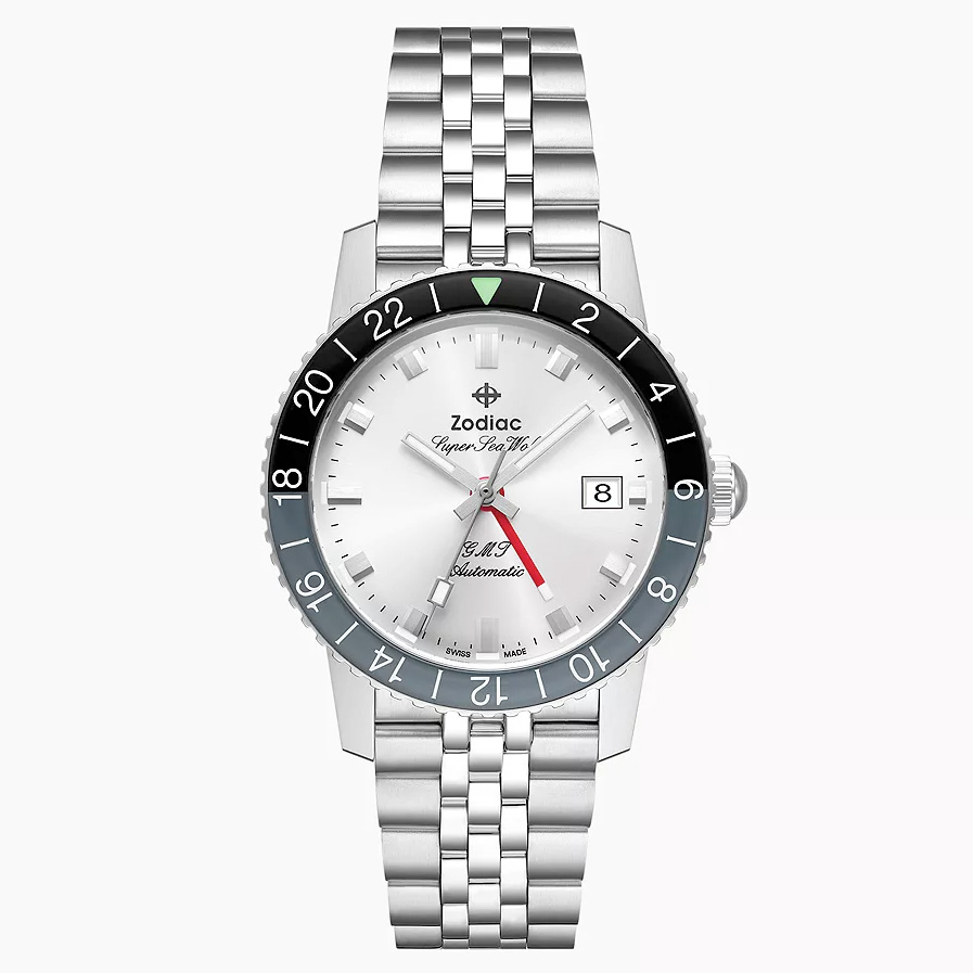 Zodiac’s 40mm Super Sea Wolf GMT watch features a silver sunray dial, Grey & black 24-hour rotatable bezel and the STP 7-20 Automatic movement with a stainless steel bracelet.